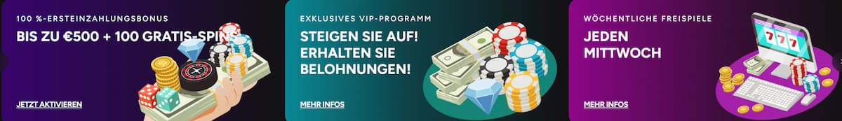 - Ersteinzahlung: 100% Bonus bis zu 500 € und 100 Freispiele
