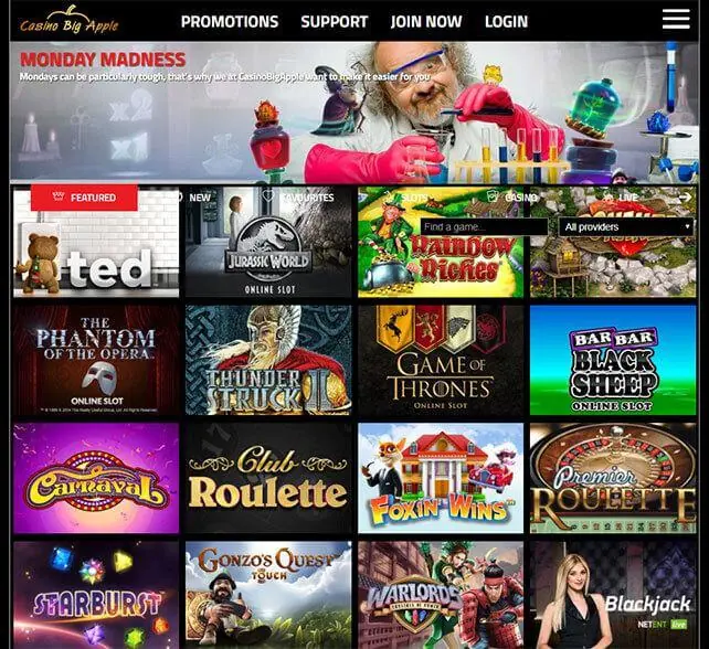 Casino Big Apple flaunts the welcome bonus and other running promotions on the top of its web page. At the middle of the casino’s webpage, you find the casino games section tabs that include Featured, New, Favourites, Slots, Casino, Live, Jackpots Casual and All.