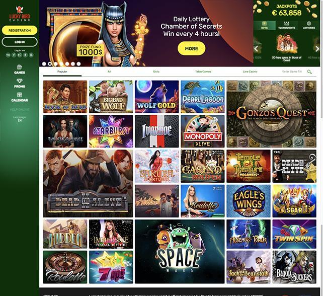 LuckyBird Casino is quite an attractive gaming platform, featuring green and yellow colors that run throughout the casino website. The dark background makes everything stand out, and the combination of all those colors sets the moods of players right after launching the casino website.